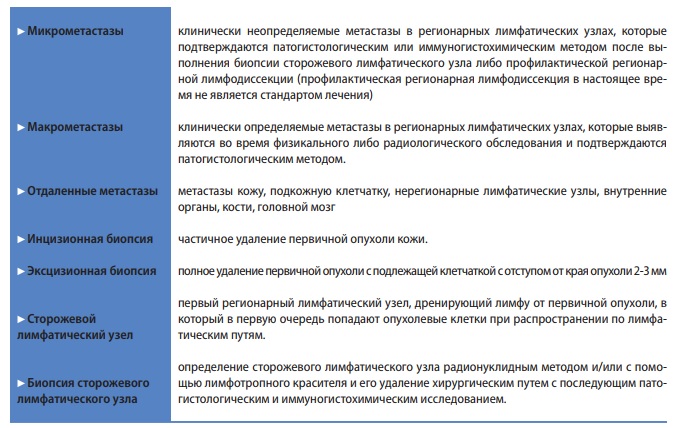 В статье рассмотрены основные понятия и термины, характеризующие первичную и метастатическую опухоль, необходимые для понимания классификации и стадирования меланомы кожи; наиболее часто используемые в специальной литературе статистические методы, в частности, анализ выживаемости и сравнение вероятностей событий; оценка общего состояния онкологического больного, необходимая для принятия решения о проведении специального онкологического лечения и включении больного в клинические исследования; критерии оценки ответа солидных опухолей на лечение, позволяющие оценить эффективность проводимой терапии.